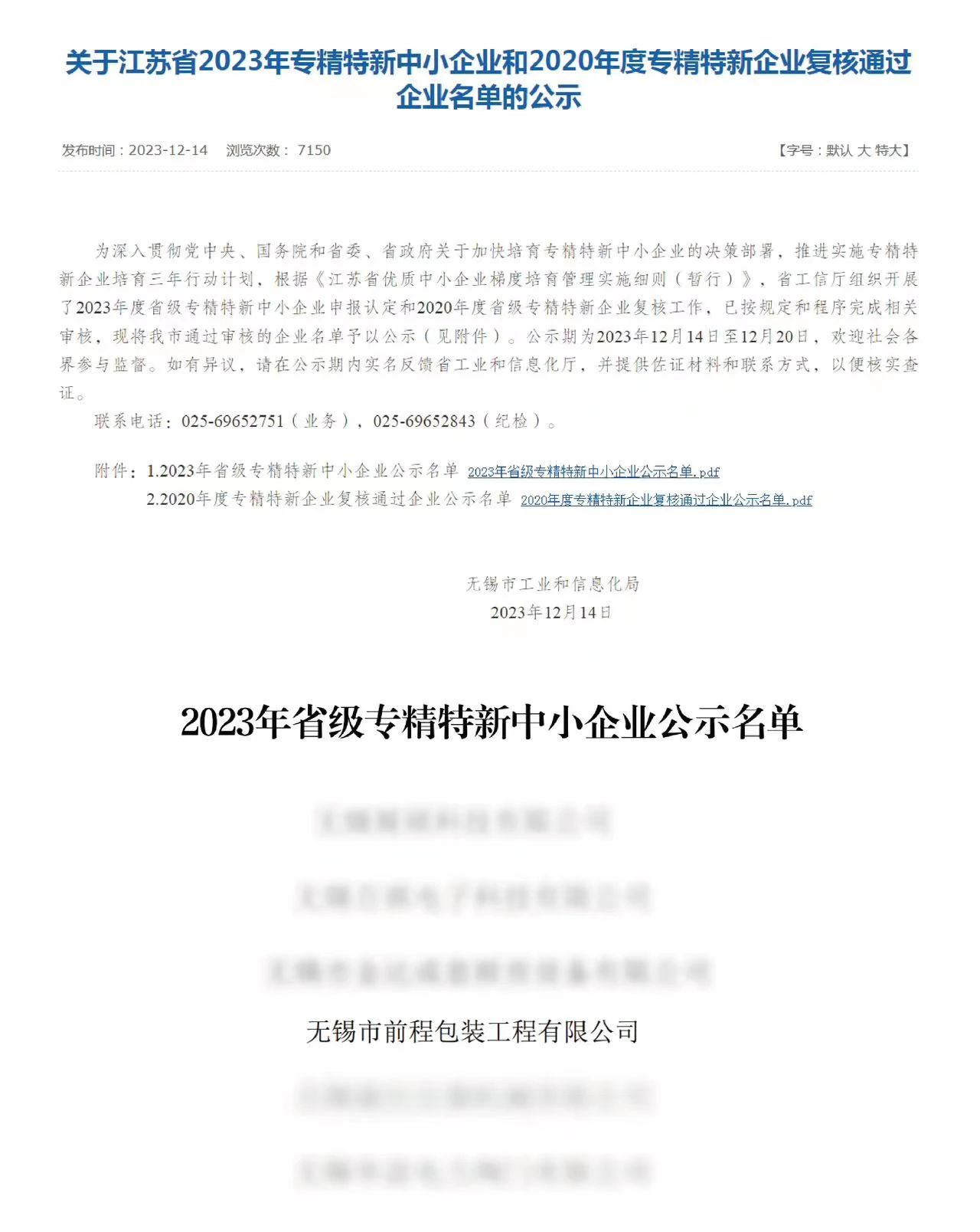 近日,無(wú)錫市工業(yè)和信息化局發(fā)布了《關(guān)于江蘇省2023年專精特新中小企業(yè)和2020年度專精特新企業(yè)復(fù)核通過企業(yè)名單的公示》,前程公司從眾多申報(bào)的企業(yè)中脫穎而出,被認(rèn)定為江蘇省“專精特新”企業(yè)。